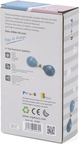 Maracasul din lemn VIGA POLARB este o jucărie muzicală clasică, simplă și totodată extrem de distractivă. Datorită prinderii ușoare, copilul o poate apuca, scutura, rostogoli și descoperi primele ritmuri. Redarea sonoră blândă protejează auzul sensibil și, în același timp, stimulează atenția și percepția.