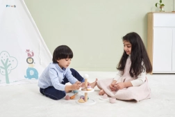 Joaca de-a ceaiul dezvoltă comunicarea, imaginația și colaborarea între copii. Prăjiturelele colorate invită la sortare și numărare, ceșcuțele și lingurițele susțin coordonarea mână–ochi și motricitatea fină. Designul elegant, în culori blânde, se potrivește frumos în orice cameră de copil.