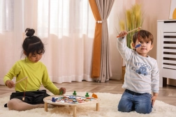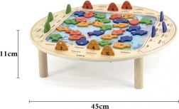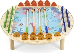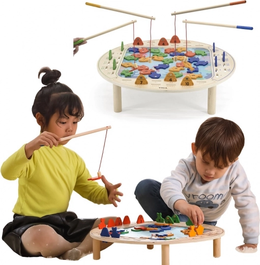 Masa din lemn cu peştişori coloraţi şi patru undiţe susţine jocurile competitive şi dezvoltarea abilităţilor motrice în colectiv.