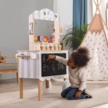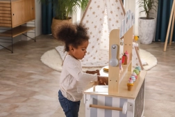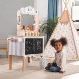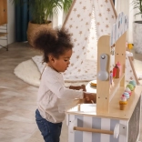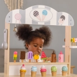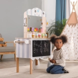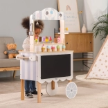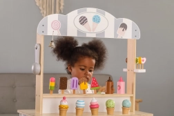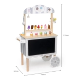 Această set de stand din lemn funcționează ca un punct de vânzare, cofetărie sau tarabă de înghețată. Copiii își pot juca scenariul preferat datorită multiplelor accesorii precum acadele, înghețate, vafe și topping-uri. O componentă excelentă este tabla pentru a scrie sau desena meniul zilei. Întregul set este vopsit cu culori netoxice în culori delicate, care atrag atenția copiilor.