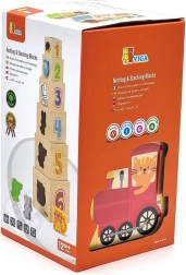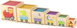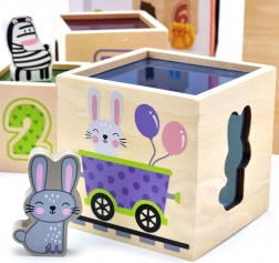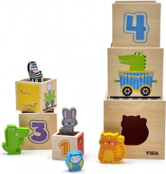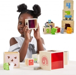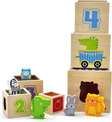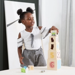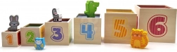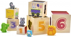 Acest set uimitor conține șase blocuri de dimensiuni diferite, fiecare având motivele sale specifice. Copiii învață astfel să deosebească numerele, formele, culorile, dimensiunile și animalele. Blocurile se pot introduce unul în altul cu ușurință sau se pot stivui, ajutând copiii să înțeleagă conceptul de organizare și ordine.