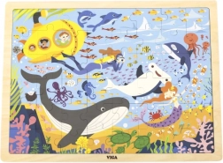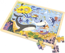 Cu puzzle-ul de lemn Viața marină descoperi o gamă uimitoare de creaturi marine, cum ar fi balenele și peștișorii, toate incluzând submarinul galben.