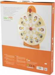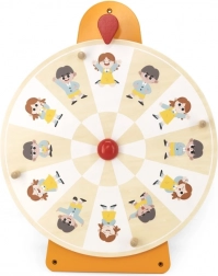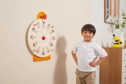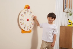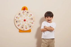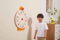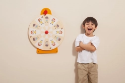 Acest joc de perete din lemn dezvoltă spiritul de observație, reacțiile rapide și coordonarea mână–ochi. Copiii învârt roata, iar săgeata indică expresia sau activitatea de imitat – astfel antrenează în mod natural exprimarea emoțiilor, gândirea logică și motricitatea fină.