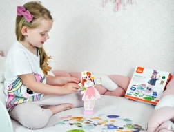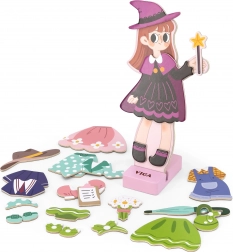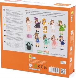 Descoperiți lumea creativă a costumelor cu puzzle-ul din lemn de calitate VIGA. Piesele magnetice de îmbrăcăminte se atașează ușor pe figurina fetiței, astfel încât copiii pot schimba rapid ținutele și crea combinații amuzante. Jucăria este realizată din lemn rezistent și colorată cu vopsele netoxice, potrivite pentru copii.