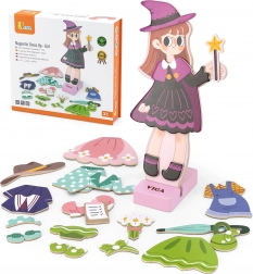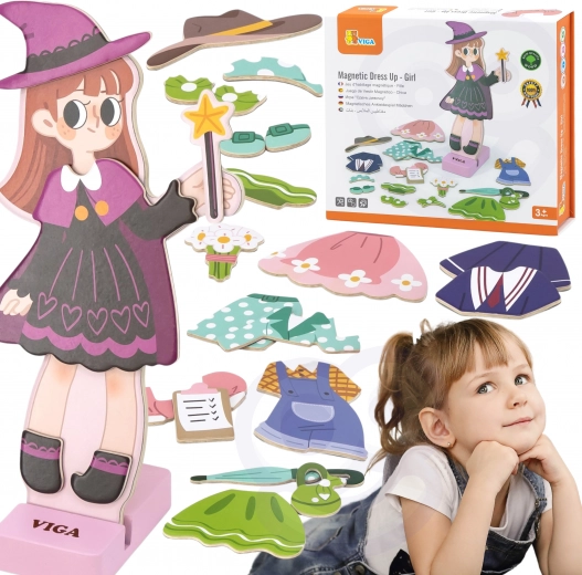Puzzle-ul magnetic pentru îmbrăcat de la VIGA este o jucărie didactică excelentă pentru copii. Copiii pot îmbrăca liber figurina din lemn a fetiței și pot combina 44 de piese de îmbrăcăminte, dezvoltând astfel motricitatea fină, creativitatea și coordonarea mână–ochi.