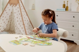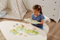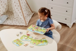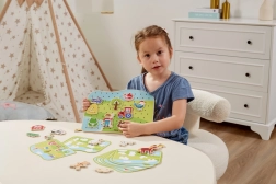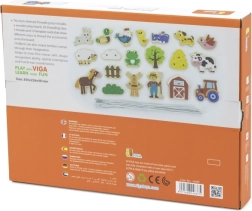 Acest set de înșirat cu tematică de fermă este un ajutor ideal pentru dezvoltarea abilităților preșcolarilor. Copiii trec șnururile prin piesele colorate din lemn, urmând modelele sau propria imaginație, întărindu-și degetele, îmbunătățindu-și priza și pregătindu-se pentru scris și desen.