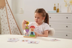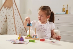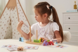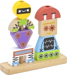Descoperiți jucăria inteligentă care crește odată cu copiii. Piesele din lemn în forme și culori diferite se fixează ușor pe știfturile bazei și permit asamblarea diverselor personaje robotice. Cărțile cu șabloane incluse ghidează de la combinații simple la unele mai complexe și dezvoltă concentrarea și răbdarea.
