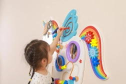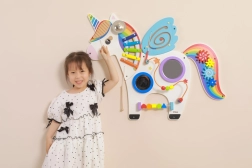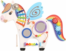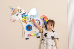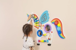Acest panou senzorial multifuncțional de perete în formă de unicorn combină elemente muzicale, tactile și logice într-un ansamblu atractiv. Copiii pot cânta la xilofon, pot învârti roțile dințate, pot încerca labirintul magnetic și oglinzile și își pot exersa culorile, formele și coordonarea mișcărilor.