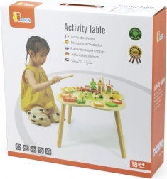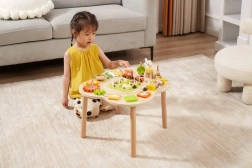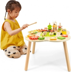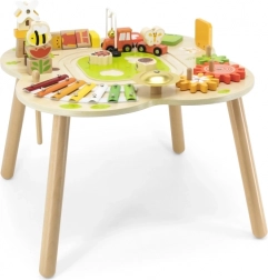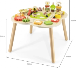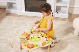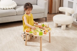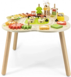Măsuța este finisată cu vopsele sigure, netoxice, în nuanțe vii, care îi motivează în mod natural pe copii să exploreze. Echiparea bogată – de la roți dințate, xilofon și clopoțel până la puzzle-uri ingenioase și traseu cu trenuleț – garantează ore îndelungate de distracție educativă în spirit Montessori.