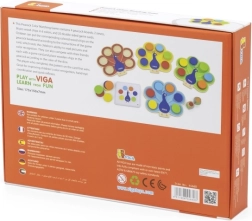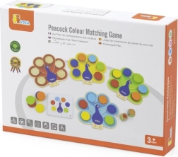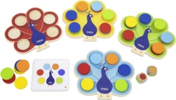 Pachetul include 4× placă din lemn în formă de păun, 36 discuri în 6 culori, 20 carduri cu sarcini față–verso și 2 zaruri colorate. Jocul susține activitatea individuală și de echipă și pregătește excelent pentru educația preșcolară.
