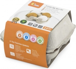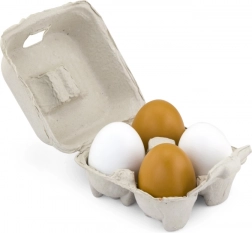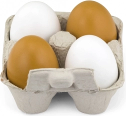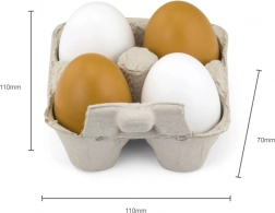 Set adorabil de ouă din lemn pentru bucătăria de joacă, conține 2 ouă albe și 2 ouă maro într-un ambalaj tip cofraj de hârtie realist. Ouăle, de aproximativ 6 × 5 cm, susțin jocurile de rol, motricitatea fină și învățarea culorilor. Ideal pentru copii de la 24 de luni.