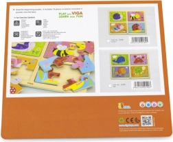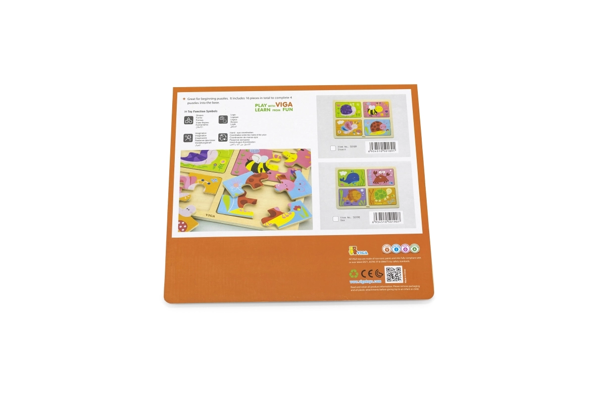 Fiecare puzzle are propria sa planșă de bază, ceea ce ușurează orientarea și îi ajută pe copii să obțină succes mai rapid. Piesele solide din lemn sunt plăcute la atingere, ușor de prins și rezistente la utilizare frecventă.