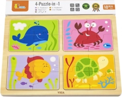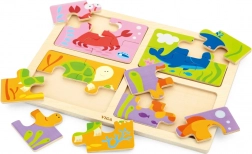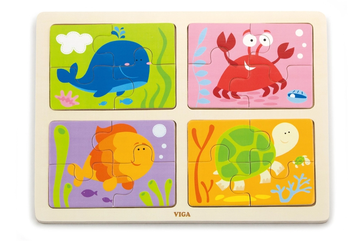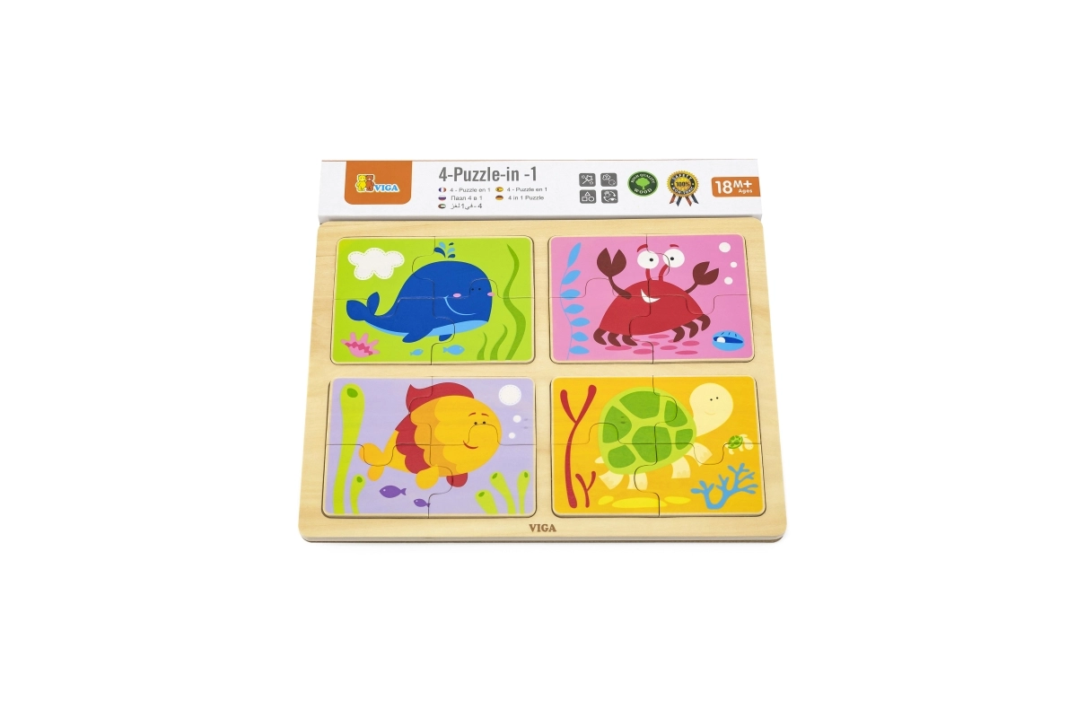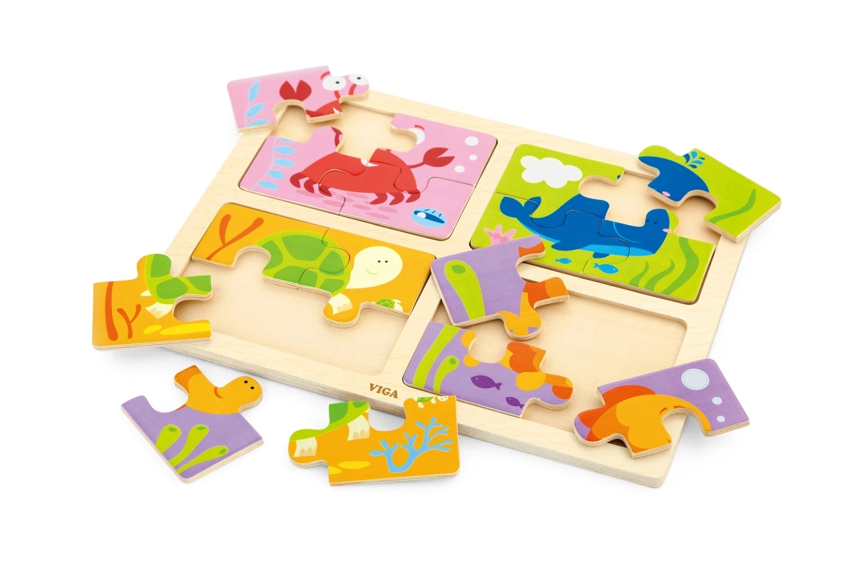 Acest set conține patru puzzle-uri simple din lemn, cu motive drăguțe ale vieții marine. Datorită numărului compact de piese, sunt ideale pentru prima familiarizare a copiilor cu asamblarea, dezvoltă coordonarea mână–ochi și învață răbdarea.