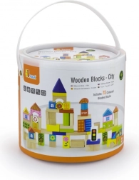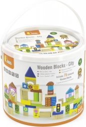 Această set de construcție din lemn oferă 75 de cuburi de diferite culori pentru construirea scenariilor urbane. Pachetul include și o broșură cu ilustrații și instrucțiuni, care inspiră copiii să creeze. Totul este depozitat într-o găleată practică cu mâner, cu dimensiuni de aproximativ 22,5 x 20 cm.