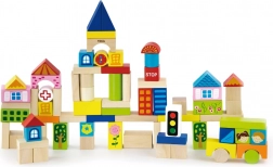 Setul cuprinde cuburi de diferite mărimi, de la 2,5 cm la 7,5 cm, permițând copiilor să creeze diverse construcții precum case, poduri și alte elemente urbane. Datorită materialului din lemn rezistent, cuburile sunt potrivite pentru jocuri de lungă durată și sigure.