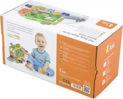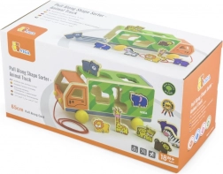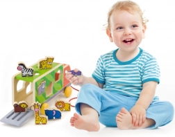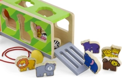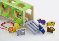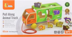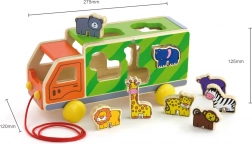 Camionul poate fi tras cu șnurul și, în același timp, servește drept sortator inteligent. Copiii își folosesc atât mișcarea, cât și gândirea logică atunci când caută orificiile potrivite pentru animale.