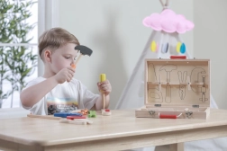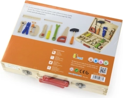 Oferiți-le copiilor un joc realist cu unelte din lemn atent realizate, într-o geantă practică. Setul conține ciocan, fierăstrău, cheie, șurubelniță și alte unelte îndrăgite, care îi ajută pe copii să-și dezvolte îndemânarea și imaginația. Datorită execuției din lemn, jucăria este rezistentă, plăcută la atingere și sigură pentru mâinile mici.