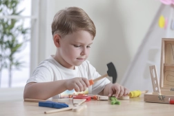 Ciocan, fierăstrău, cheie, șurubelniță și alte unelte colorate motivează jocul creativ și dezvoltă motricitatea fină și coordonarea.