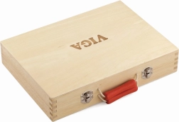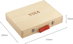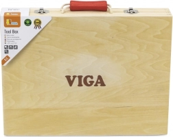 Valiza din lemn rezistentă, cu închizători metalice și mâner roșu, păstrează totul la locul lui, astfel încât nu se pierde nimic. Datorită organizării clare, fiecare unealtă are locul ei, iar întregul set este ușor de transportat la vizite, în călătorii și în camera copilului.