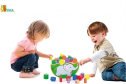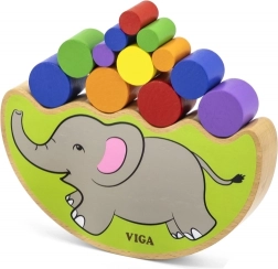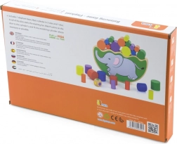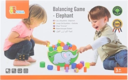 Joc distractiv din lemn pentru copii de la 3 ani, care dezvoltă motricitatea fină, răbdarea și coordonarea mână–ochi. Jucătorii aruncă un zar colorat și, în funcție de culoarea obținută, iau sau așază un cilindru pe baza în formă de elefant – fără să-l răstoarne!