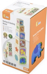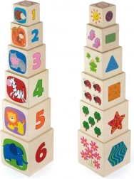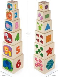 Setul conține 6 cuburi rezistente din lemn, de dimensiuni diferite, din care copiii pot construi un turn stabil sau le pot introduce unul în altul. Ilustrațiile bogate cu animale, culori, forme și elemente numerice susțin învățarea timpurie și îmbogățesc vocabularul.