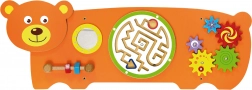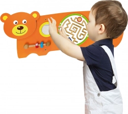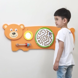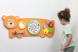 Placa senzorială Ursuleț este concepută după principiile Montessori pentru a-i motiva natural pe copii să descopere și să exerseze abilități. Oferă mai multe tipuri de activități: rotirea roților dințate, ghidarea bilei în labirint, observarea în oglinda sigură și antrenarea prizei cu ajutorul șuruburilor pe filet. Datorită construcției robuste din lemn și posibilității de montare pe perete, este ideală pentru camerele copiilor, săli de joacă și grădinițe.