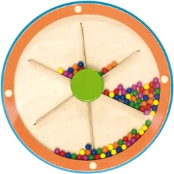 Roata rotativă cu biluțe colorate stimulează văzul și auzul, susține concentrarea și motivează la joc interactiv suplimentar.