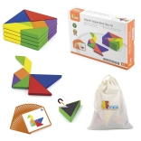 Setul include forme colorate din lemn și carduri de provocare cu modele pentru asamblare progresivă. Acest tip de joc integrează în mod natural metodele Montessori, îi învață pe copii răbdarea și concentrarea și întărește coordonația mână–ochi. Datorită ambalajului practic, jocul se depozitează ușor și poate fi luat în călătorii.