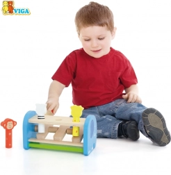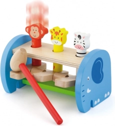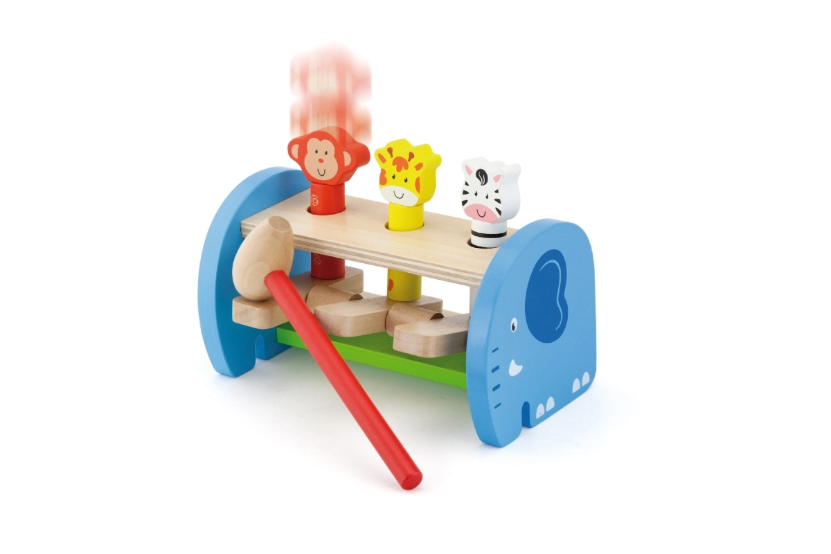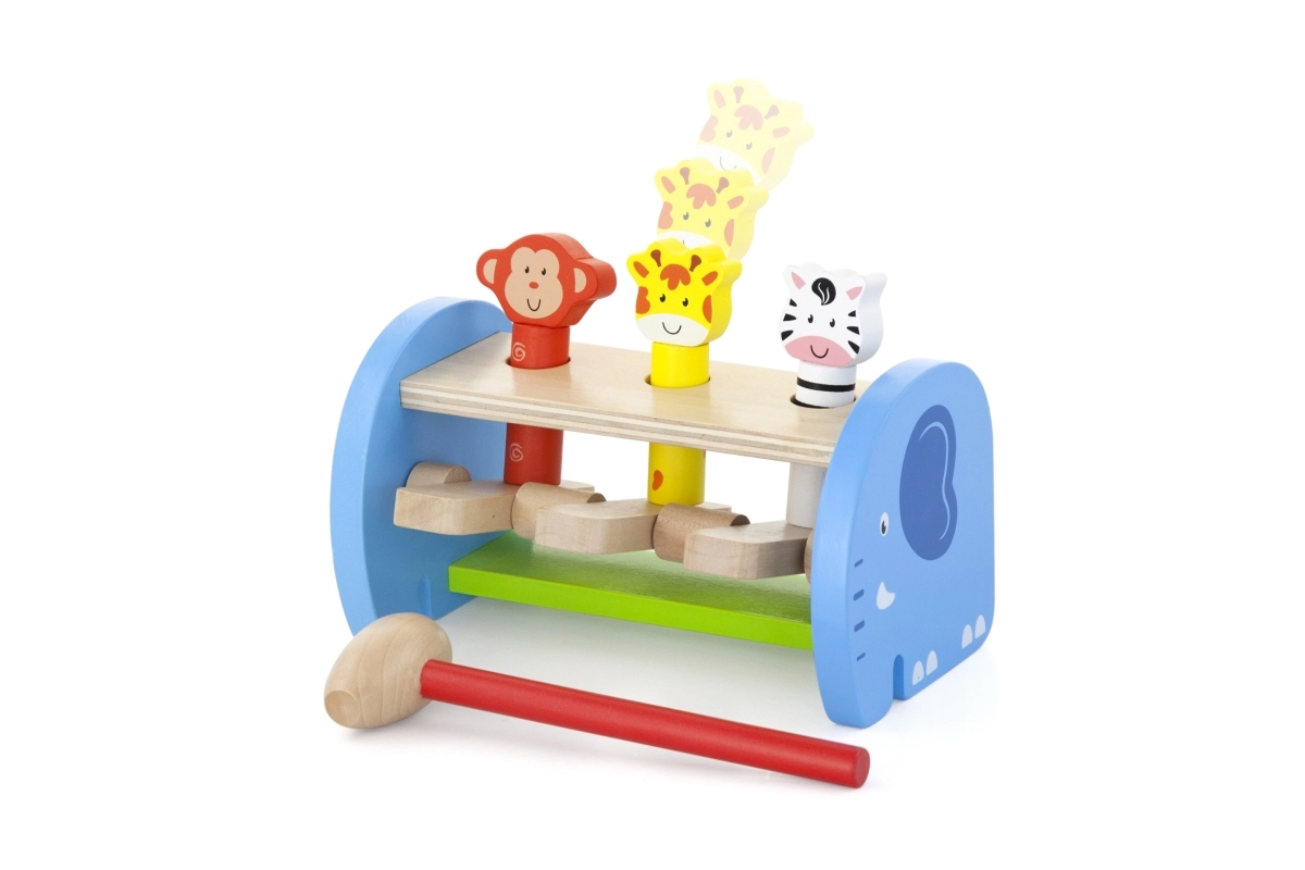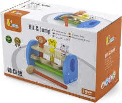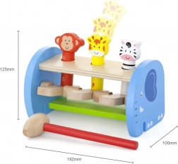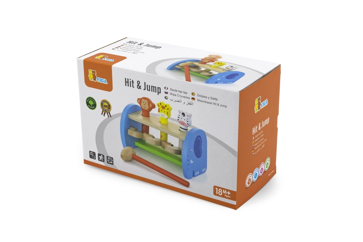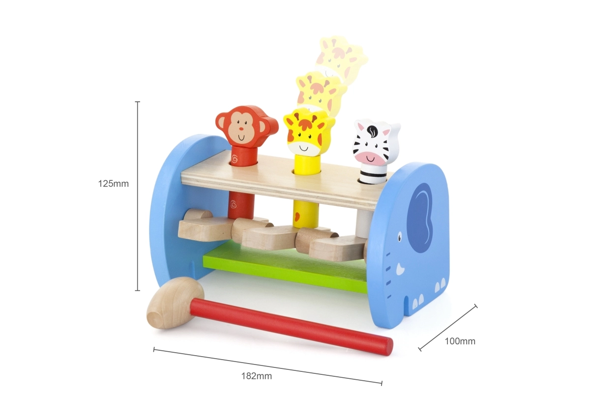 Această jucărie din lemn de calitate oferă joacă sigură și colorată cu animăluțe simpatice. Copiii folosesc ciocănelul pentru a acționa mecanismul care face animăluțele să sară – astfel își perfecționează priza, forța de strângere și precizia mișcărilor. Construcția solidă și marginile netede asigură siguranță în utilizarea zilnică.
