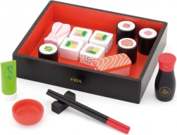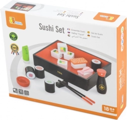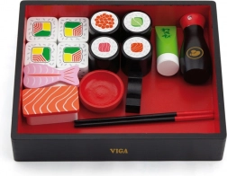 Setul include diferite piese de sushi din lemn, bețișoare pentru mâncare, un recipient pentru sos de soia și un platou de servire, care imită perfect experiența autentică de servire a sushi-ului. Este o modalitate excelentă de a-i familiariza pe copii cu diverse tipuri de mâncăruri și de a-i învăța abilități de bază ale bucătăriei japoneze.