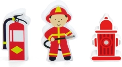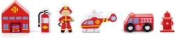 Include pompieri, stație de pompieri, extinctor, hidrant, camion de pompieri și elicopter, toate în culori vii pentru un joc palpitant.