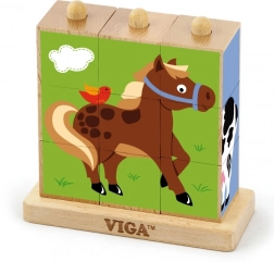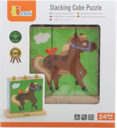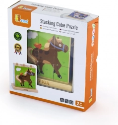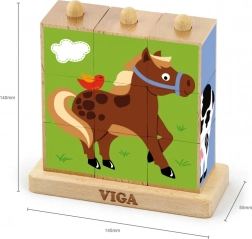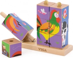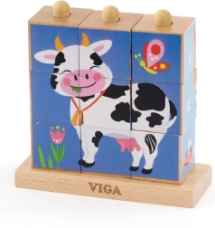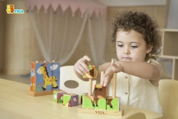 Din 9 cuburi asamblați 4 motive diferite – vacă, găină, cal și cățel. Copiii își exersează asamblarea vizuală, diferențierea culorilor și își antrenează răbdarea.