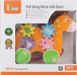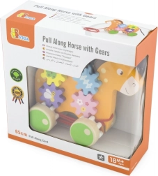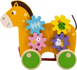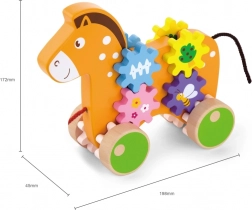 Căluțul are roți dințate colorate care se rotesc în mișcare, ajutând copiii să își dezvolte abilitățile motorii.