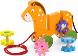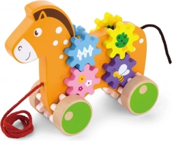 Descoperiți bucuria jocului cu căluțul nostru de tras din lemn, soluția ideală pentru micii exploratori. Acest căluț cu corp portocaliu strălucitor și roți dințate colorate oferă o experiență de joc stimulativă plină de distracție și educație.