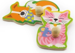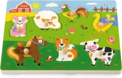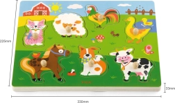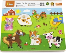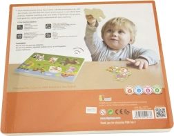 Puzzle din lemn cu animale, cu sunete. După plasarea corectă a animalului, se aude sunetul pe care îl emite acesta. Dimensiunile plăcii: aprox. 30 x 22,5 x 2 cm. Alimentare: 2 x baterii AAA (neincluse). Dimensiunile ambalajului: aprox. 30 x 27 x 2 cm. Vârsta: 18 luni+