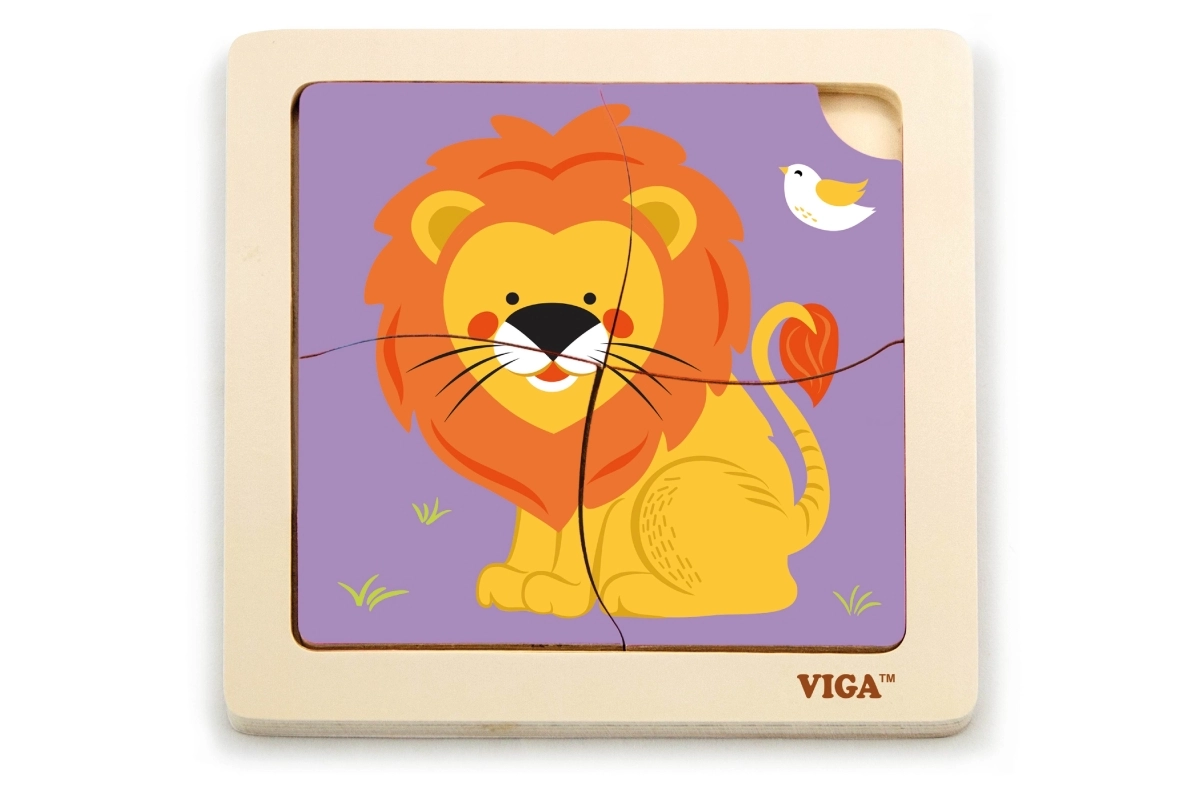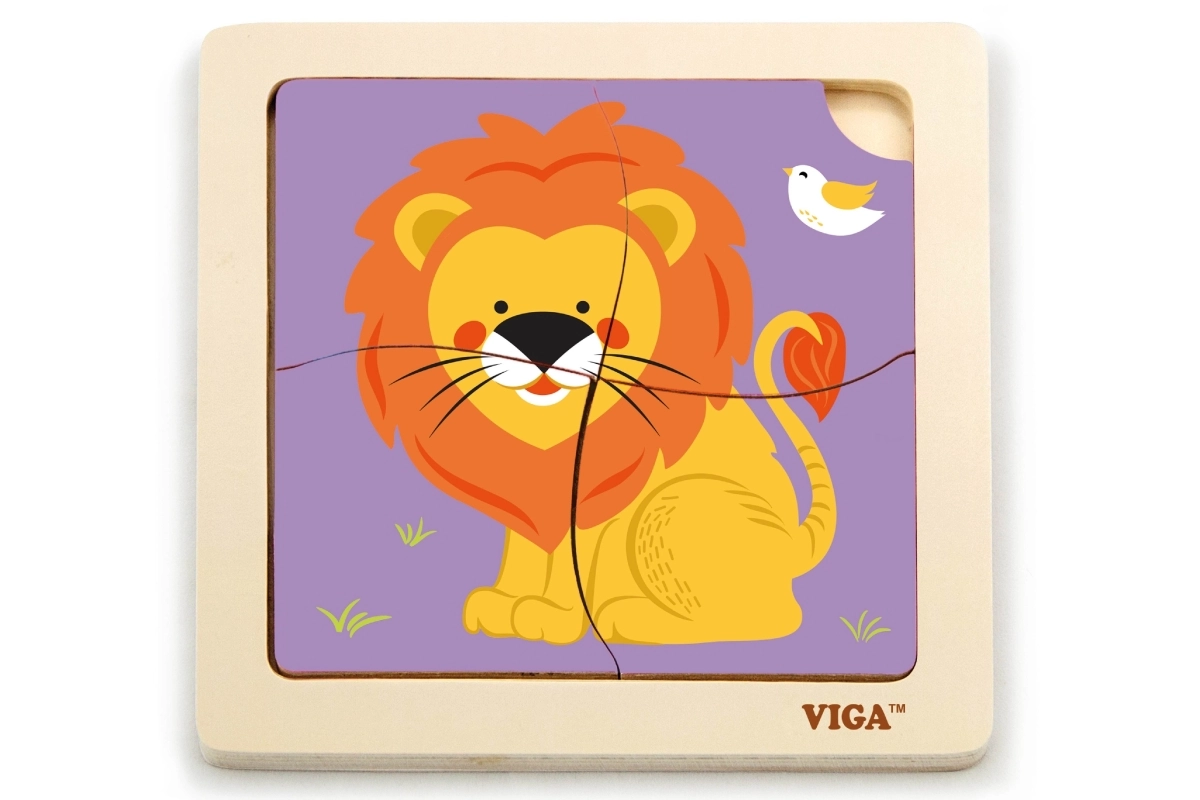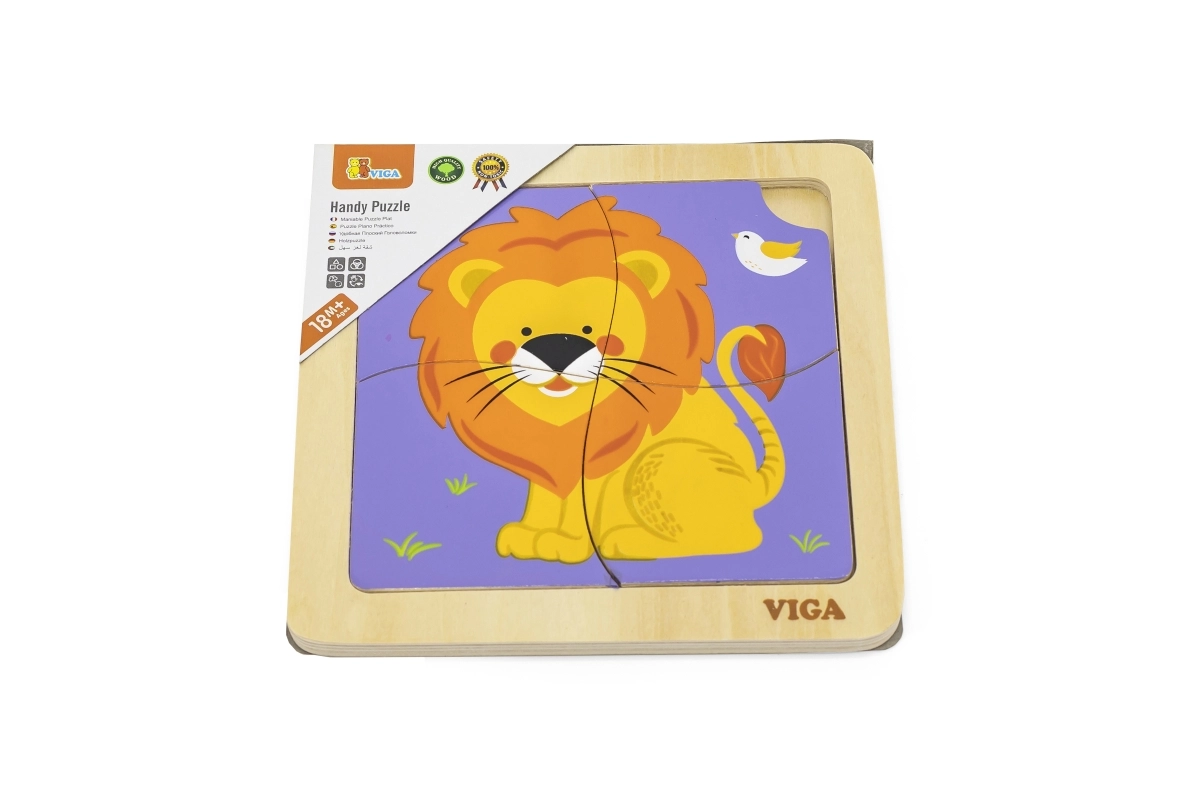 Un puzzle din lemn adorabil cu motiv de leu, perfect pentru cei mai mici, de la 18 luni. Patru piese mari, ușor de prins, într-o bază solidă din lemn susțin motricitatea fină, coordonarea mână–ochi și primele exerciții de gândire logică. Dimensiunea compactă de aproximativ 12 × 12 cm este ideală atât în călătorii, cât și acasă.