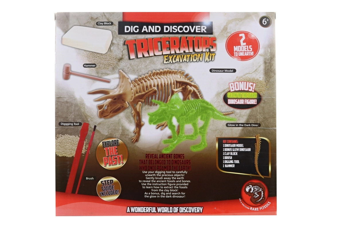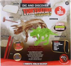 - Bloc de săpare, ciocănel, pensulă, instrument de săpare, schelet de triceratops (10 piese), figurină care luminează în întuneric