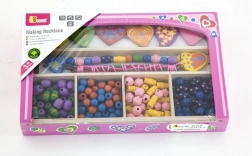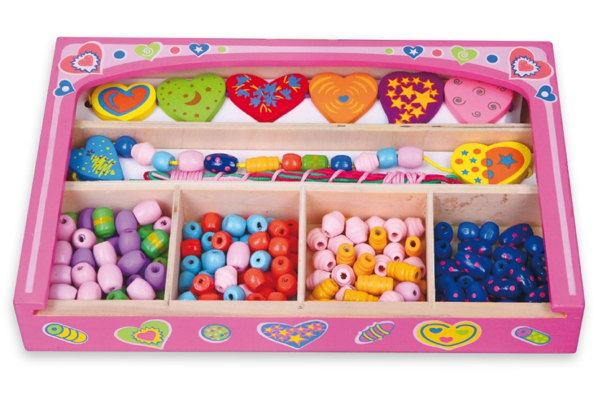 Mărgele de diferite dimensiuni și forme – inclusiv inimioare și steluțe – îi inspiră pe copii să creeze bijuterii unice și le dezvoltă imaginația.