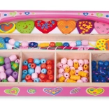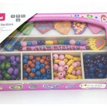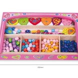 - Mărgele din lemn multicolore, forme (de ex. inimioare, steluțe), șnururi pentru înșirat, cutie din lemn cu compartimente