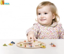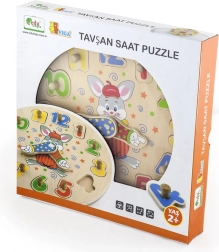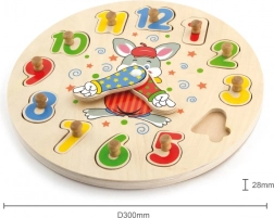 Ceas educativ din lemn, distractiv și sigur, care funcționează și ca puzzle încastru. Cu cele 12 piese colorate cu butoni, copiii exersează cifrele 1–12 și bazele citirii ceasului, dezvoltând motricitatea fină, gândirea logică și recunoașterea culorilor și formelor. Diametru aprox. 30 cm, recomandat de la 24 de luni.