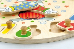 Baza din lemn, rezistentă și cu margini netede, este ideală pentru joaca zilnică acasă sau la grădiniță. Datorită diametrului mare, de aproximativ 30 cm, cifrele sunt ușor de citit, iar manipularea pieselor este confortabilă.