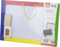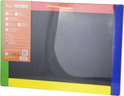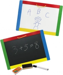 Această tablă universală reunește două suprafețe creative într-una singură – o față neagră, magnetică, pentru cretă și o față albă, ștergibilă, pentru marker. Copiii pot scrie, desena și exersa litere și cifre; pe partea neagră pot prinde ușor și magneți. În pachet găsiți totul pentru utilizare imediată: 4 crete, un marker ștergibil și un burete.