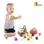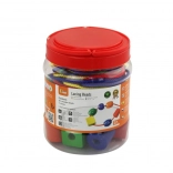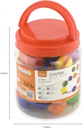 Mărgelele sunt depozitate într-o cutie din plastic rezistentă, cu capac, care facilitează transportul și păstrarea. Setul oferă învățare prin joc acasă și la grădiniță și este un excelent complement pentru activități Montessori.