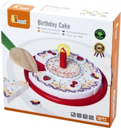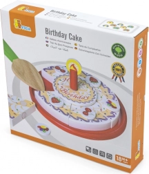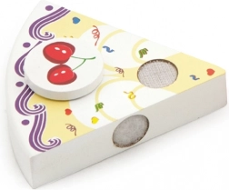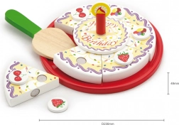 Tortul aniversar din lemn, pe o tavă de servire, este împărțit în felii individuale cu decorațiuni și lumânare. Datorită elementelor cu arici/magneți (în funcție de variantă), piesele se separă și se reunesc ușor. Copiii își exersează prinderea, precizia și vocabularul în „suflarea lumânării” și servire.