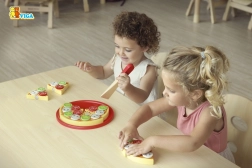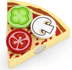 Diverse toppinguri din lemn (de ex. ciuperci, ardei, roșii) stimulează imaginația și învățarea culorilor și formelor.