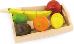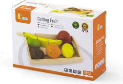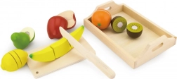 Fructele și cuțitul sunt fabricate din lemn natural, asigurând siguranță și durabilitate în timpul jocului.