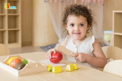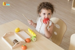Fructele pot fi tăiate și reunite din nou cu o singură mișcare datorită benzilor velcro, ceea ce ajută la dezvoltarea abilităților motorii fine.