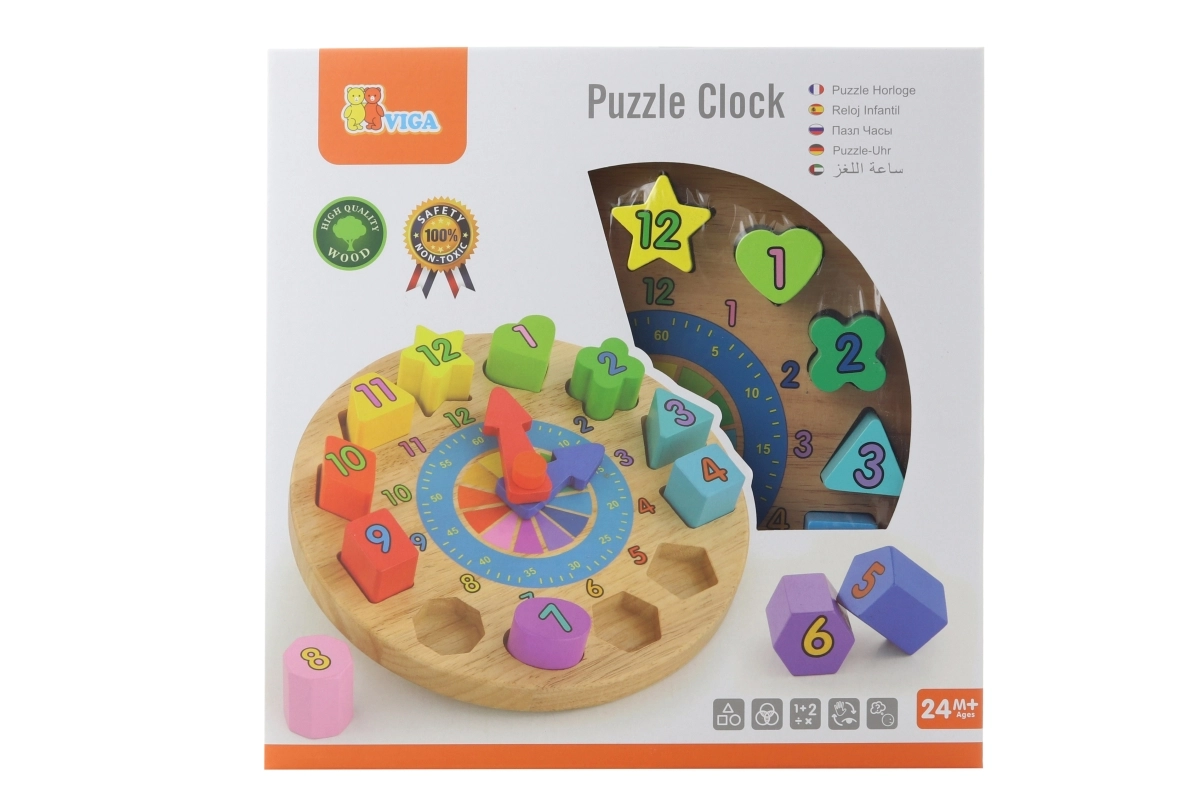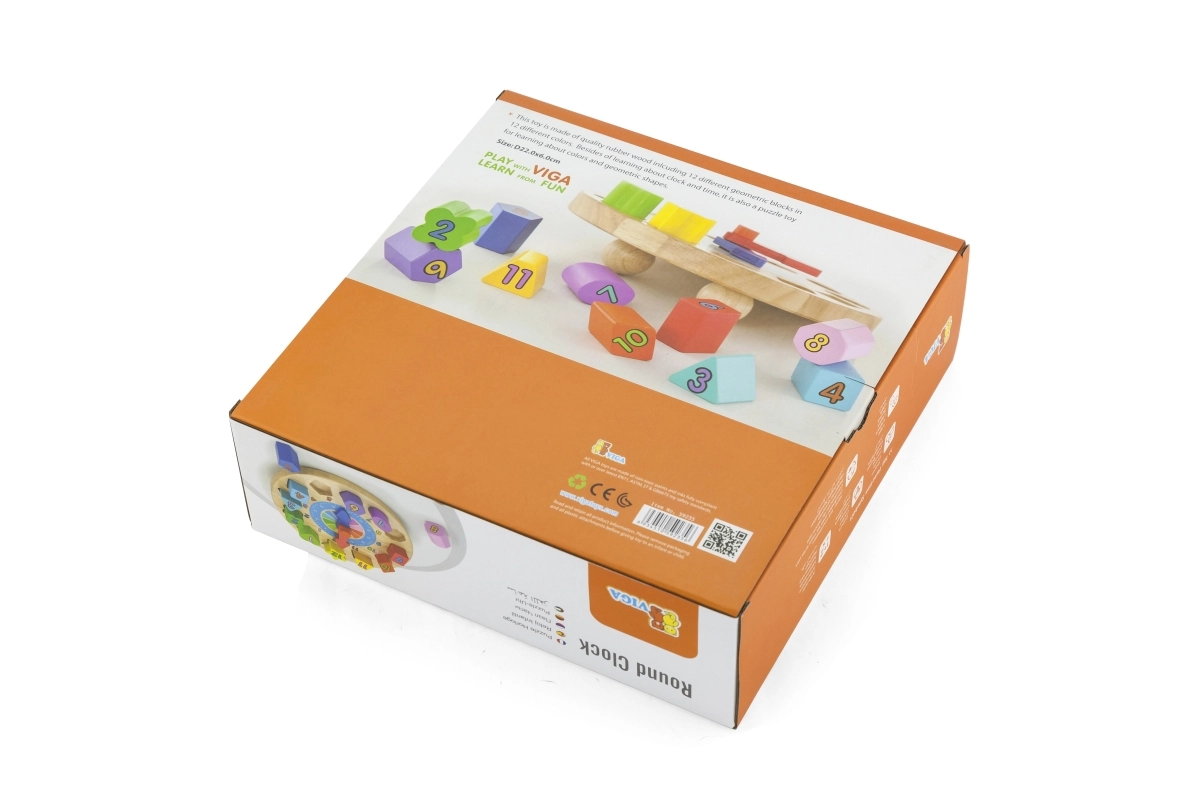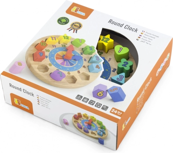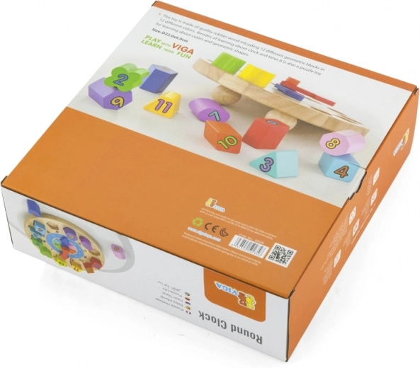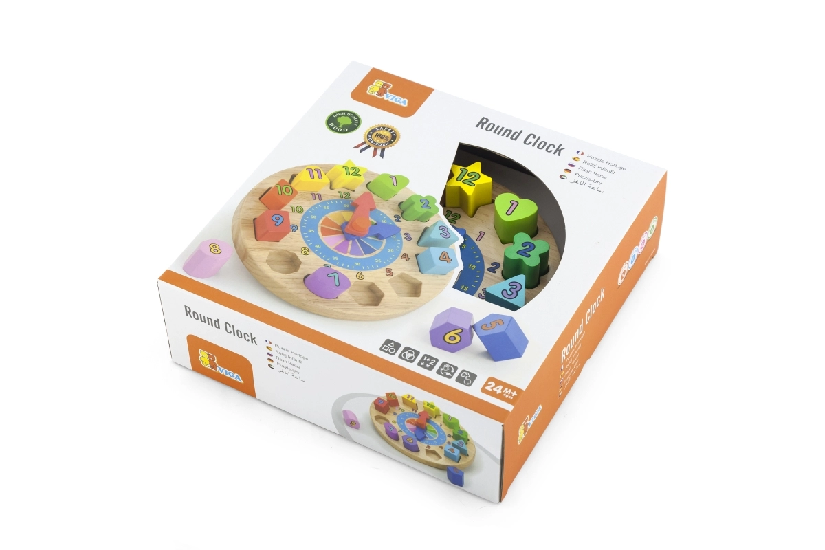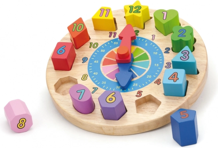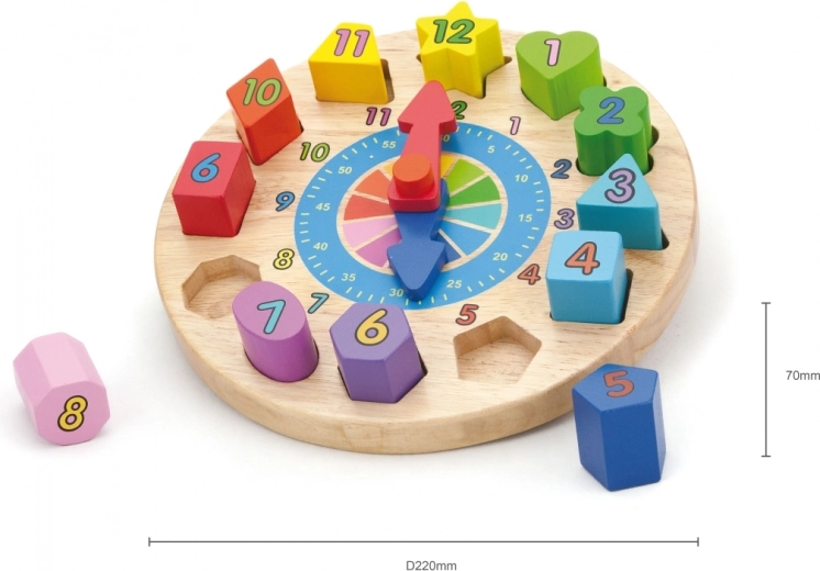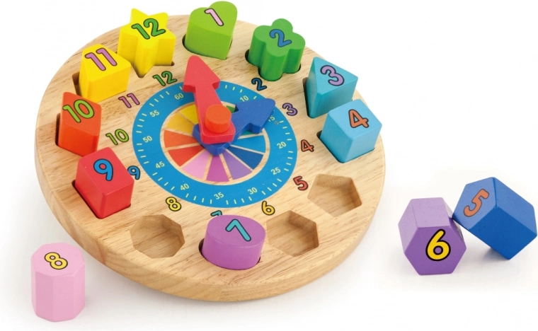 Ceas din lemn distractiv și educativ pentru cei mici, ajută la învățarea recunoașterii timpului, culorilor și formelor. Conține 12 piese colorate de inserat cu numere, care dezvoltă motricitatea fină, logica și coordonarea mână–ochi. Jucărie ideală pentru copii de la 24 de luni.