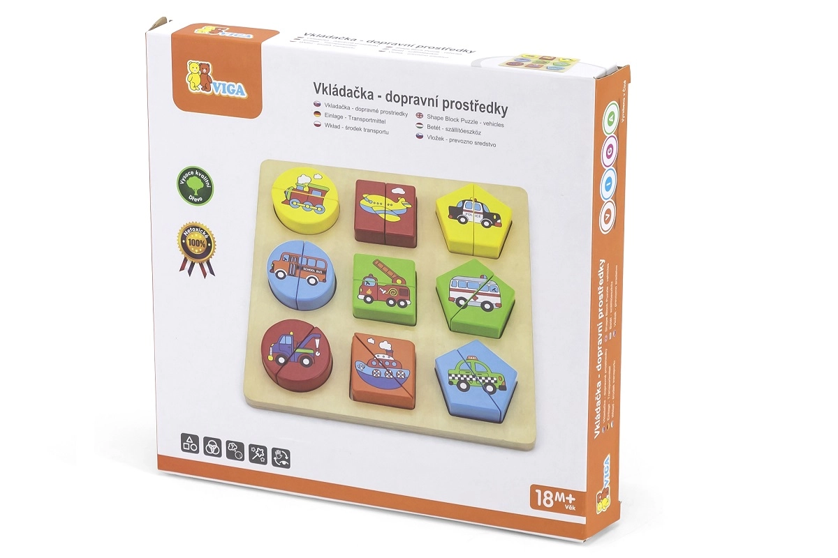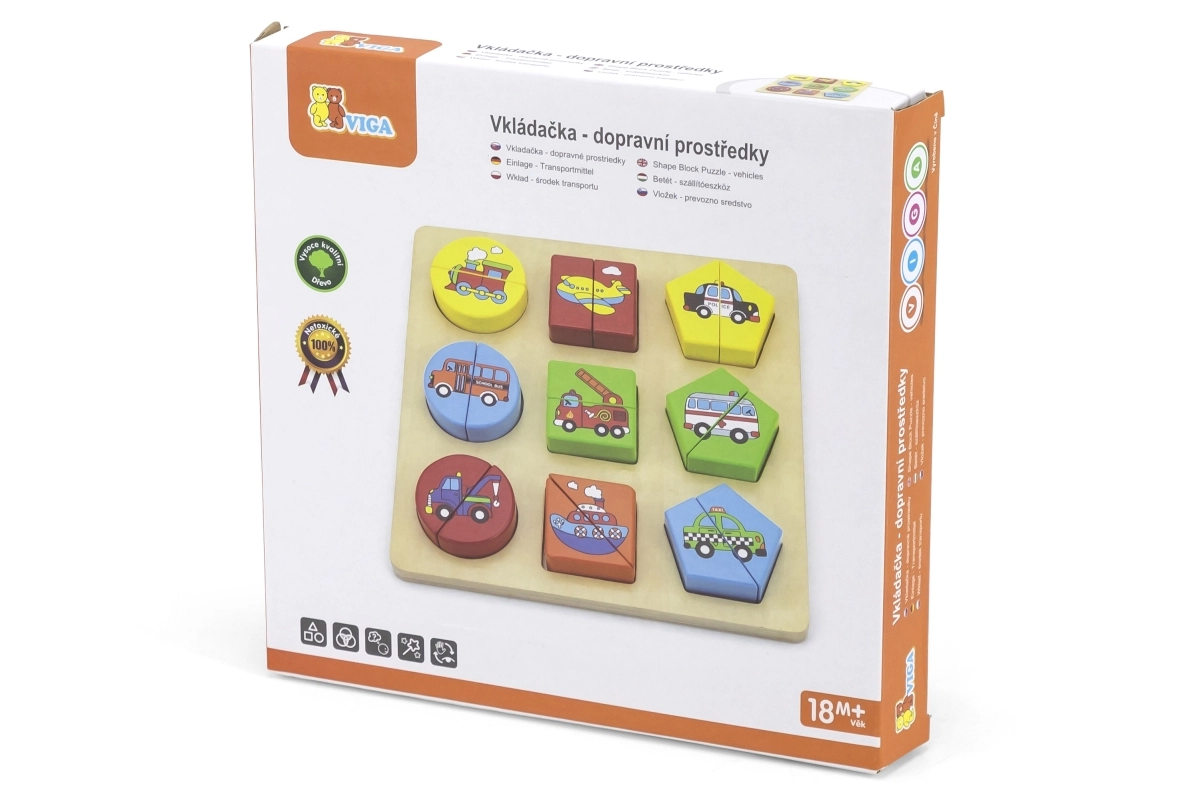 Puzzle din lemn pentru cei mai mici, în cutie în limba cehă. Conține 18 piese din care se pot forma 9 imagini. Dimensiunile unei piese: aproximativ 4,5 x 2,5 cm. Dimensiunile ambalajului: aproximativ 20,5 x 21 x 3 cm. Vârsta: 18 luni+