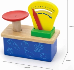 Cântarul are dimensiuni practice de aprox. 18,5 × 20 × 8,5 cm, se ține confortabil în mână și este realizat dintr-o combinație de lemn și plastic rezistent. Este sigur pentru copiii de la 3 ani și susține imaginația, motricitatea fină și abilitățile sociale.